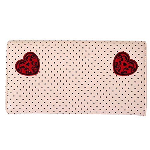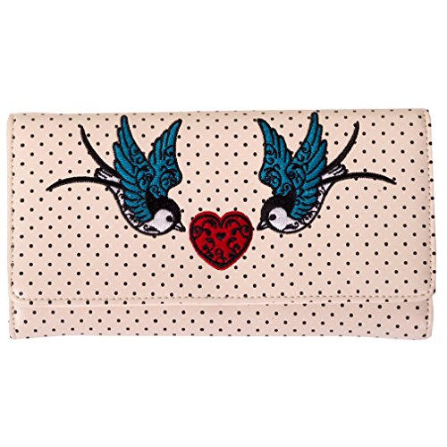 Binding : Apparel Product Description - Material: 100% Polyurethane, Lining: 100% PVC - Dimensions: approx.19,5 x 3 x 10 cm - All-Over polka dot pattern - Embroidered swallows and heart on front - Embroidered heart on back - Snap-button closure - Zip compartment for coins - Two large compartments for bank notes - 13 credit card slots, including one transparent one - Two bank note sized side slots
