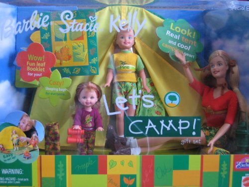 -. Feature : Special Edition Barbie Stacie Kelly Let's Camp Gift Set "R"Us Exclusive is a 2001 Mattel production. / Includes: Barbie Doll approx. 11.5" tall, Barbie Outfit: T-Shirt, Shorts, Socks, Hiking Boots (Shoes), & Hair Ties. Stacie Doll approx. 7.5" tall, Outfit for Stacie: T-Shirt, Shorts, Shoes, & Socks. Kelly Doll approx. 4.5" tall, Outfit for Kelly: T-Shirt, Pants, & Shoes. Set also includes a Real Tent (Doll size), 3 x Sleeping Bags (for each Doll), a Lantern, a pair of Binoculars, & a Fun Leaf Booklet for YOU! / Included items are Pretend & Doll Size, as above! Box is 15" x 10.5" x 6". / For Ages 3+ Years. All the provided sizes, colors & details are to the best of my ability, approximate & may vary. / For Box Condition Information, see CONDITION NOTE or Email Seller for Details. Box plastic has tiny dings on top edge.