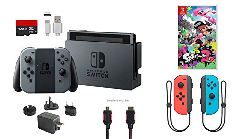 -. Feature : Bundle Included:Includes a Switch console, Switch dock, Joy-Con (L) and Joy-Con (R), 2 Joy-Con strap accessories, 1 Joy-Con grip, AC adapter, HDMI cable. Extra Joy-Con (L/R)-Neon Red/Neon Blue, 128 GB SD Card,Game Disc Splatoon 2, Type C Cable,HDMI Cable and Wall Charger / Enhanced Parental Control:The system includes various on-device parental controls, but parents can also download a smart device application that can be used to easily and conveniently monitor and set parental controls for Nintendo Switch. / Joy-Con controllers:They can be inserted into a Joy-Con grip accessory to be used like traditional controllers, held comfortably in each hand for independent left and right motion controls, or shared between two players for multiplayer gaming. / Surround sound:TV Mode supports 5.1 channel surround sound. Through the system's built-in audio jack, stereo speakers or headphones can be used when playing in handheld or tabletop modes. / Add this Nintendo Joy-Con to your Nintendo Switch console so friends can join in. Depending on the game, its two parts can be split or given to a second player, and it can be joined together or connected to the console for handheld play. Each part of this Nintendo Joy-Con has its own buttons, an accelerometer and a gyroscope for independent control.