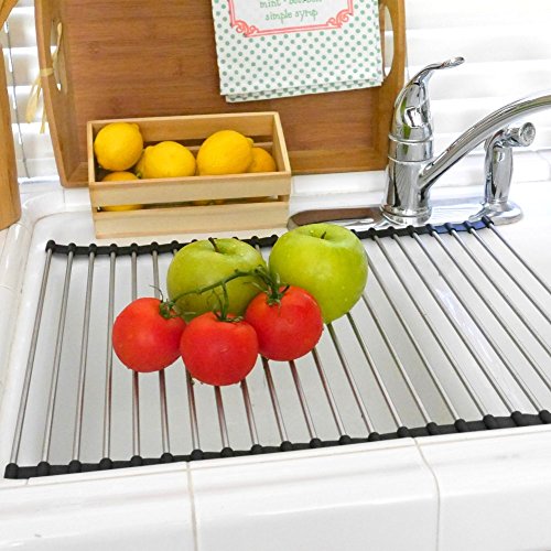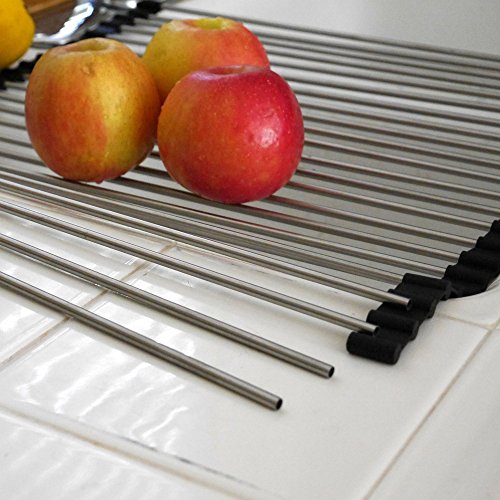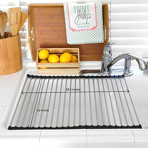 SPACE SAVER; we take pride in the high quality of our stainless steel rollup dish drying rack, which measures 18.5 x 16 inches. It's much wider than competing products, meaning that it will easily fit atop your sink, providing a lot of space for drying dishes and defrosting foods!