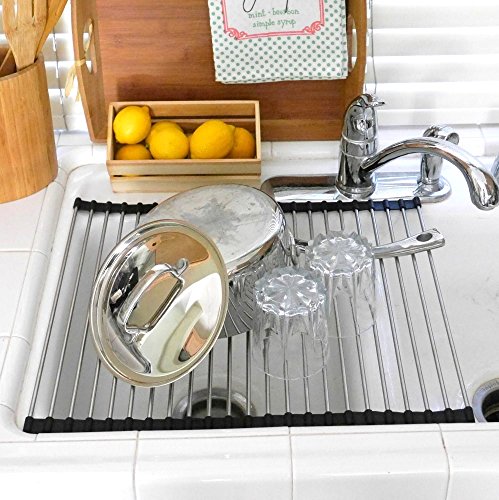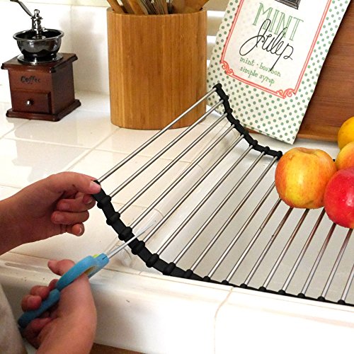 LARGE ROLL UP DISH DRYING RACK, STAINLESS STEEL 18.5 X 16 INCH, ROLLABLE, EASY STORAGE, DEFROSTING FOODS, COOLING RACK, TRIVET, OVER THE SINK, SPACE SAVER, EASY TO CLEAN, HEAT RESISTANT 450F - BLACK