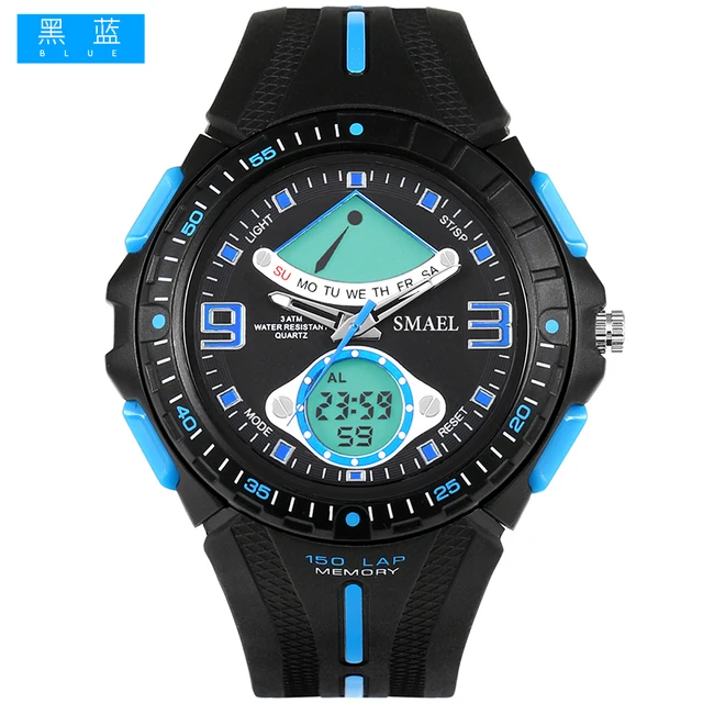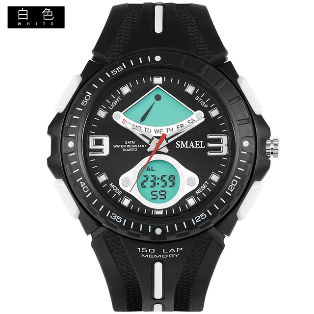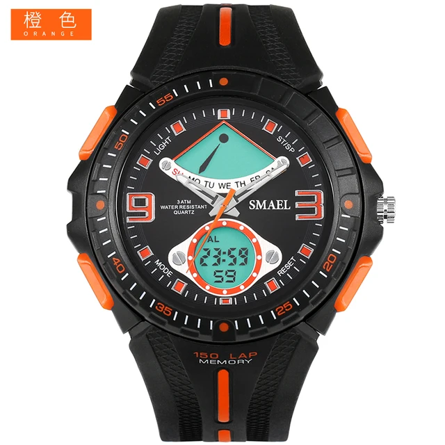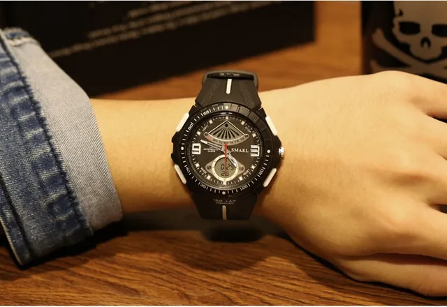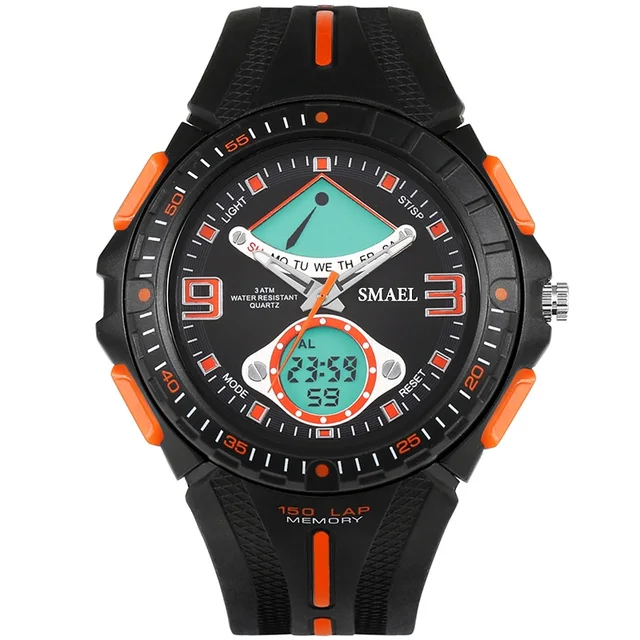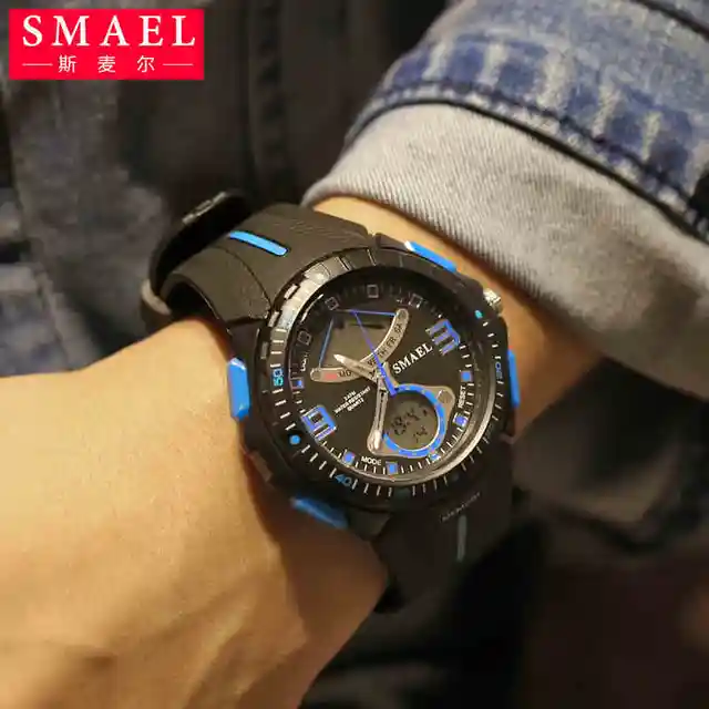 상품 내용 환경 소재 1. 브랜드: SMAEL 2. 듀얼 시간 EL 백라이트 기능 보여줍니다 3. 30 메터 방수, 수 수영. 4. 유형: 남성 스포츠 시계 5. 운동: 일본 원래 디지털 운동 6. 선택 5 색 7. 밴드 폭: (약) 2.0 센치메터 8. 다이얼 직경: (약) 4.9 센치메터 9. 스트랩 소재: 강한 PU 10. 케이스 재질: 강한 고무 + 고강도 강화 유리 11. 걸쇠: 버클 12. 보여주는 정확한 시간 포장 상세