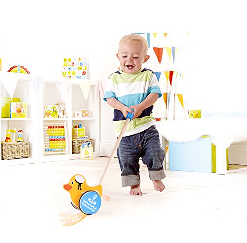 【AWESOME LONG-LASTING TOY】 If your baby child just begins to walk, he or she would love pushing the lovely toy. It is very comfortable to hold the handle. For little one who doesn¡¯t learn to walk can also push it back and forth from a sitting position. It makes bright sound but not overly loud, the clack-clacking sound when pushed is quite pleasant. The wooden toys are corrosion-resistant & wear-resistant, could be used on carpet or tile.