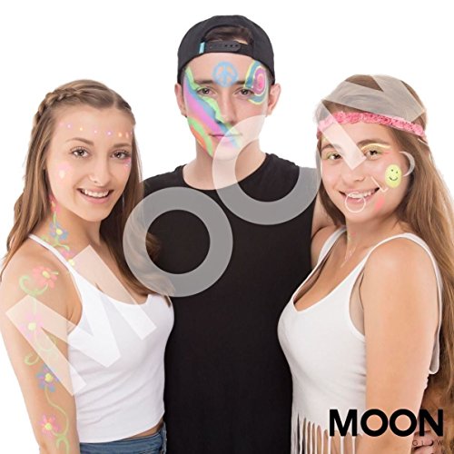 -. Feature : Brightest Glow under Blacklight - Guaranteed! / Genuine Moon Glow branded product. Made in the United Kingdom. / Bright, neon coloured in natural light, and produces an incredible glow under UV Lighting/Blacklights! / Easy to apply, dries quickly, simple to remove with soap and water / Dermatologically Tested, Non Toxic, Conforms to EU1223/2009.