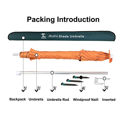 This is a very light weight sun Shade Umbrella,It's easy to assemble and takes almost no time to put up. Once up it is sturdy and durable. It comes in a nice zippered bag that has a strap on the side making for easy carry and travels. which is great and it gives us good protection from the sun and rain.This is very well made of nice high quality materials that should hold up well over time and through prolonged use.You can also adjust the angle of this to help prevent the sun from beaming down on you and causing you to get to hot.You can avoid the heat beating down on you anywhere you go. you can use it anywhere there's sun. you can flex bend the umbrella in different directions.Ideal for the beach, camping, sports and picnics Are very practical, when you have it you can get a very comfortable environment and make your outdoor life better. Aoske you deserve to have