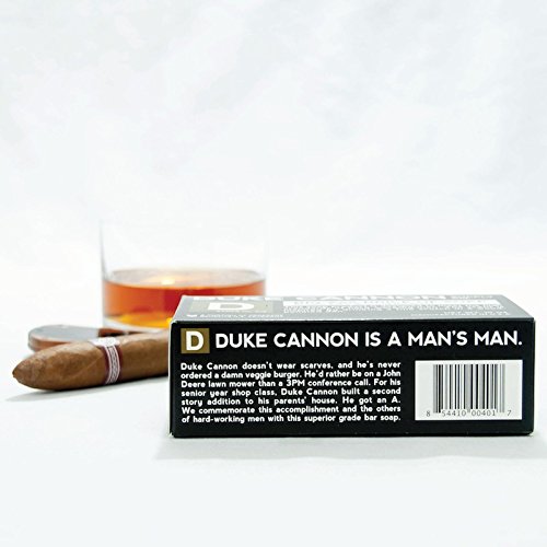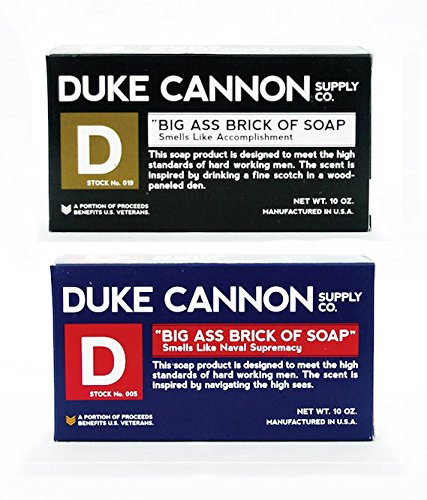 -. Binding : Misc. -. Brand : Duke Cannon Supply Co -. EAN : 0689483158769 -. Feature : Set of two 10 ounce soaps - 3 x bigger than regular bar soaps / Triple Milled Hand Soaps with steel cut grains are designed to meet the high standards of hard working men / Accomplishment scent is inspired by drinking a fine scotch in a wood-paneled den / Naval Supremacy Scent is inspired by navigating the high seas / Made in USA in the same plant that was the P.R.Imary supplier of military soap for over 20 years; Never teted on animals; A portion of proceeds benefits U.S. veterans -. Label : Duke Cannon Supply Co -. Manufacturer : Duke Cannon Supply Co -. MPN : DUKE3299 -. PackageQuantity : 2 -. PartNumber : DUKE3299 -. ProductGroup : Beauty -. ProductTypeName : BEAUTY -. Publisher : Duke Cannon Supply Co -. Size : 10 OZ -. Studio : Duke Cannon Supply Co -. Title : Duke Cannon Large Brick of Soap Pack - Naval Supremacy and Accomplishment - Made in USA -. UPC : 689483158769
