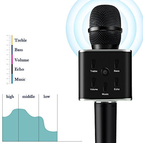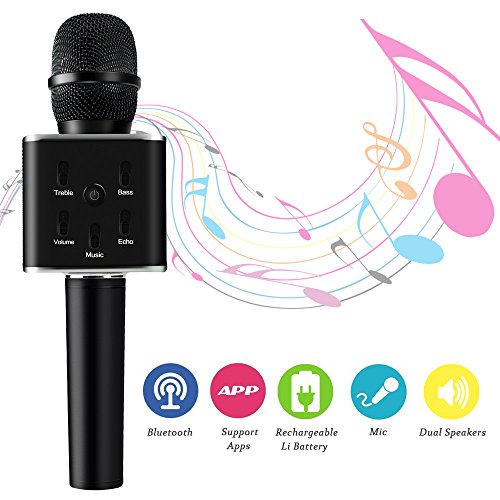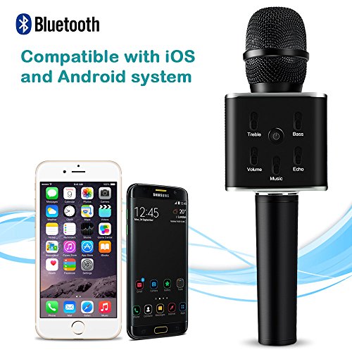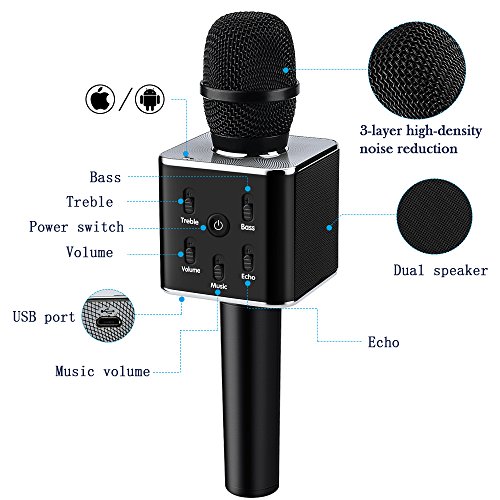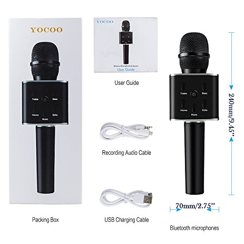 *Why Yocoo Q7 Wireless Karaoke Microphone: Intelligent mixing chip & professional audio processor: Bring you more clear and high quality sound. Designed with dual speakers: Comes with dual built-in speaker, you don't need extra speakers in your party. This wireless karaoke microphone makes the best birthday or holiday gift for adults or kids who enjoy singing along with their favorite songs. 2 Connection Mode A:Bluetooth Mode (sing with bluetooth microphone) B:Wired Mode (singing recording same time function) We have user manual come with the Q7 Mic to let you know the detailed connection operations Specification Audio Monitoring: Capacitor Material: Aluminum and magnesium alloy Weight: 393g(13.86oz) Output Power: 3Wx2(speak output) Charging Voltage: DC 5V Charging Time: 2-3hours Battery Working Time: 6-7 hours Products Size: 70*70*240mm(9.45''x2.75'') Speaker Frequency: 100Hz-10KHz Power Supply: build-in Li-ion battery Maximum sound pressure level: >115db 1KHz THD<1% Battery Capacity: 2600mAh Reverb Mode: Echo Sound Reverberation Package Contents: 1*Yocoo Q7 Wireless Karaoke Microphone 1*USB Cable 1*User Manual 1*Micro USB to Audio Cable If any questions, please do not hesitate to contact us and we will try our best to help you !Feature