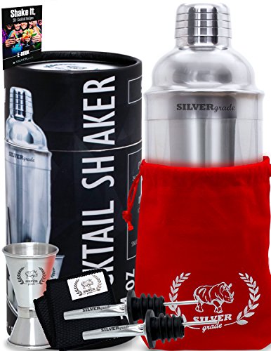 - COMPLETE SET FOR COCKTAIL LOVERS: If you are a bartender, or you have a passion for creating amazing cocktails, then this Martini shaker set is going to blow your mind off! Our set includes a shaker cup, lid and cap, a double jigger, 2 bottle pourers, a velvet bag and a cleaning fabric- everything you need in order to make a perfect cocktail is here!