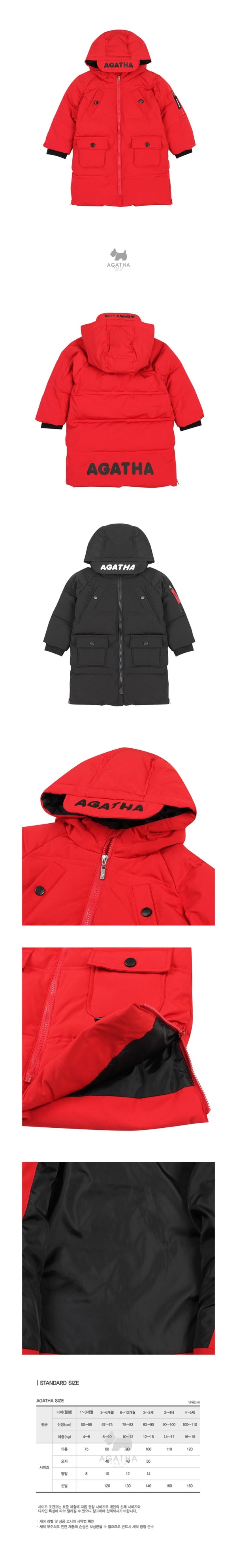 모자 챙 부분과 뒷 밑단에 로고 레터링 나염이 들어간 롱 오리털 패딩 점퍼로 소매에 레터링 테이프 장식으로 포인트를 준 아이템입니다.