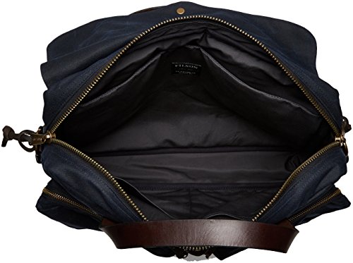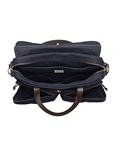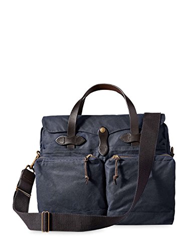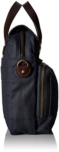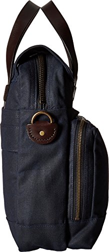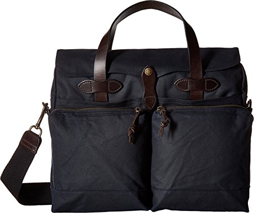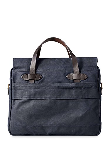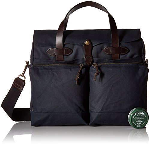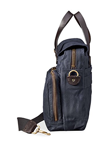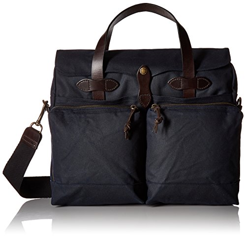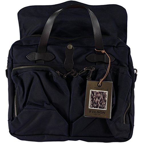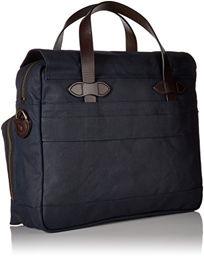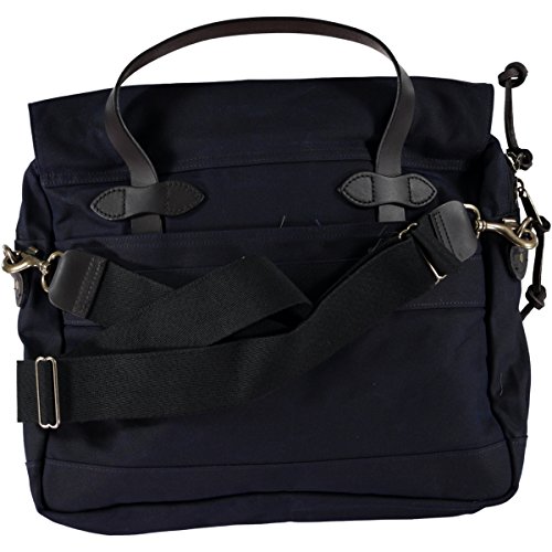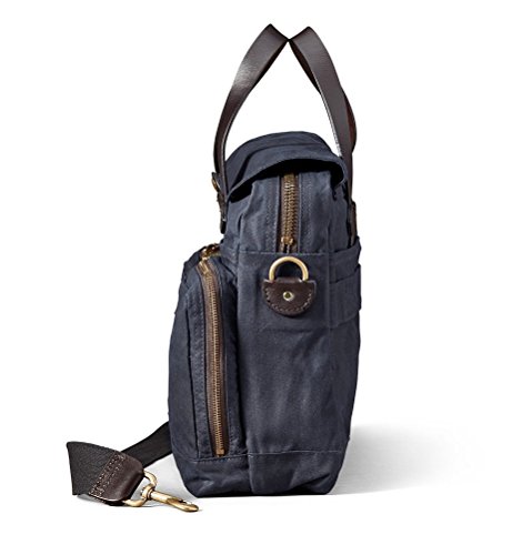 Product Description ?Storm flap with snap closure ?Interior divider, 2 slotted zipper pockets, 2 interior stow pockets ?Trolley strap on back slides onto rolling luggage handles ?Bridle leather carrying handle ?Removable, adjustable webbing shoulder strap ?Interior laptop divider ?Sized to fit a standard laptop up to 15" wide ?Includes iconic Filson Bridle Leather body tabs 0