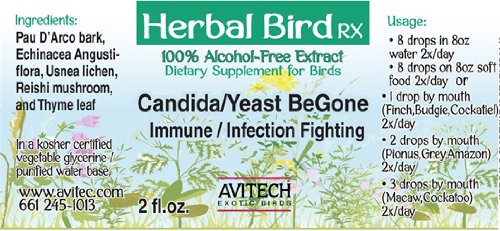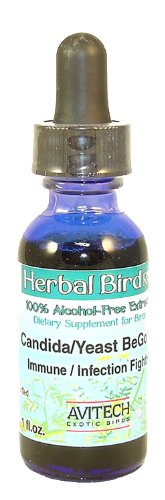 Studio : Avitech Exotic Birds Publisher : Avitech Exotic Birds Binding : Misc. Product Description The Herbal Rx formula Candida/Yeast BeGone uses Echinacea Angustiflora to help energize the immune system while eliminating yeast or candida infections with Pau D'arco bark, Usnea, Reishi and Thyme. Great for handfeeding babies who develop candida infections and for treating infected adults who routinely produce infected babies. Candida/Yeast BeGone is intended for situational rather than long term use. While herbs are often bitter and difficult to use with animals, who object to the taste, these Herbal Bird Rx formulas are so palatable that they can be placed directly in the mouth, mixed into food, or added to drinking water. 0