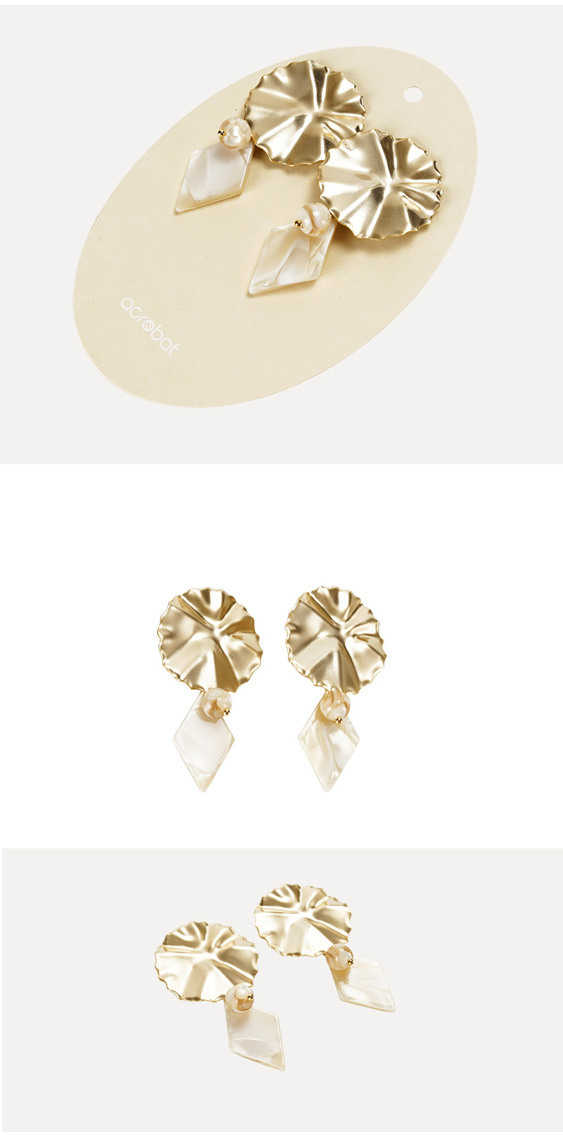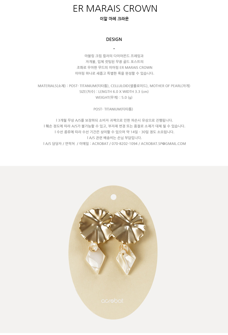 l 마블링 크림 컬러의 다이아몬드 프레임과 자개볼, 입체 컷팅된 무광 골드 포스트의 조화로 우아한 무드의 이어링 ER MARAIS CROWN 이어링 하나로 새롭고 특별한 룩을 완성할 수 있습니다.