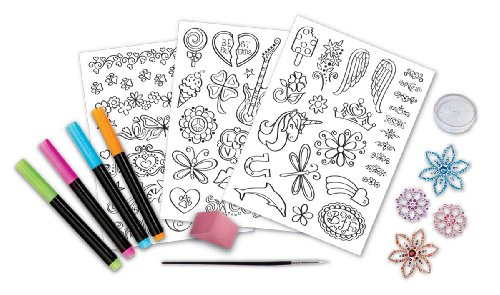 -. Binding : Toy -. Brand : Creativity for Kids -. EAN : 0092633109908 -. Feature : Create your own washable body art / The tattoo markers can be used again and again to create hundreds of temporary tattoo designs / Ages 6-15 years -. IsAdultProduct : 0 -. IsAutographed : 0 -. IsMemorabilia : 0 -. Label : Faber Castell -. Manufacturer : Faber Castell -. Model : 1099000 -. MPN : CFK1099 -. PackageQuantity : 1 -. PartNumber : CFK1099 -. ProductGroup : Toy -. ProductTypeName : TOYS_AND_GAMES -. Publisher : Faber Castell -. Studio : Faber Castell -. Title : Color-in Glitter Tattoos -. UPC : 063451387434 -. Warranty : 30 day warranty against manufacturer defects