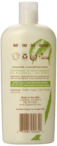 -. Feature : 100% Certified Organic Coconut Oil / Made in the tropical islands of Fiji. / Use as a massage oil, moisturizer, or hair treatment / Great for cooking too! / Deeply moisturizing oil for entire body.