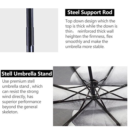 -. Feature : It's made of 100% polyester pongee waterproof fabric. / Windproof and won't turn inside out-Anti-wind umbrella stand, solid without deformation, not easy to break. "Wind Resistant Umbrella" construction means your rain umbrella won't fail you when you need it most, leaving you and your belongings protected from the elements. This wind resistant umbrella is a must have! / Portable - weighing just 10 ounces, it's small and light enough to carry anywhere - in your purse, backpack, briefcase or even your pocket - which means that you can carry it with you and you will never get wet again. Making this the ultimate travel umbrella. / Adult sized - It may be a compact umbrella when folded, but it instantly opens to a generous 38 inches diameter, which is large enough to protect one man or woman and whatever they're carrying. / Three fold umbrella: This umbrella length 23.5cm, umbrella face diameter 94cm,big blocking area, easy to carry, suitable for walking out shopping