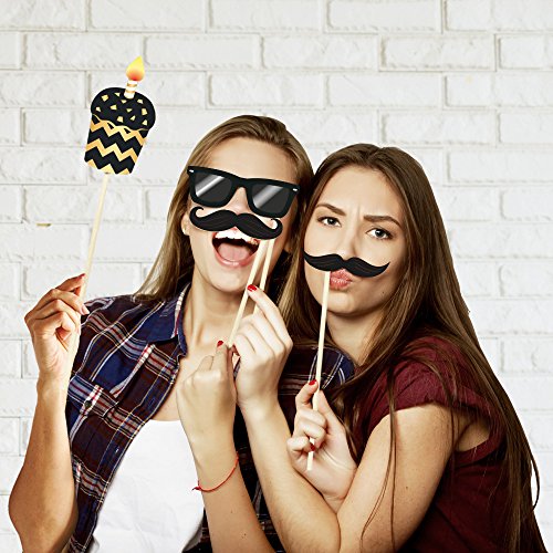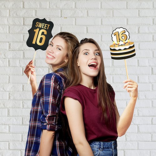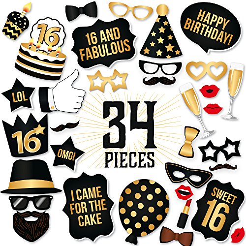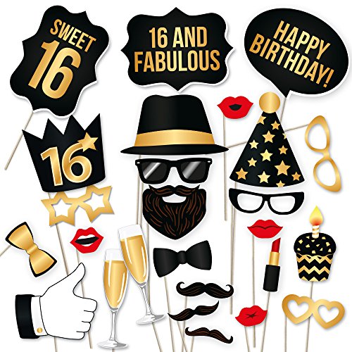 16th Birthday Photo Booth Props by PartyGraphix. DIY 16th Birthday Party Props Kit (34 Count, Black and Gold)