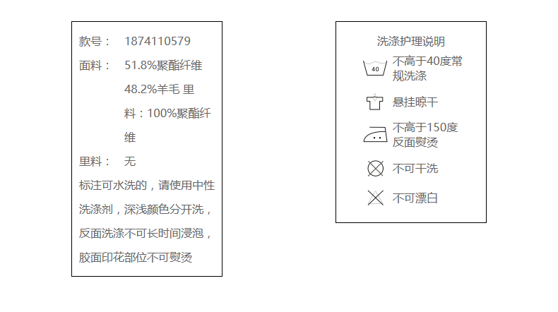 51.8%聚酯纤维 48.2%羊毛 里料:100%聚酯纤维