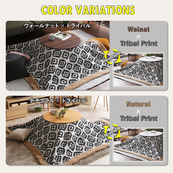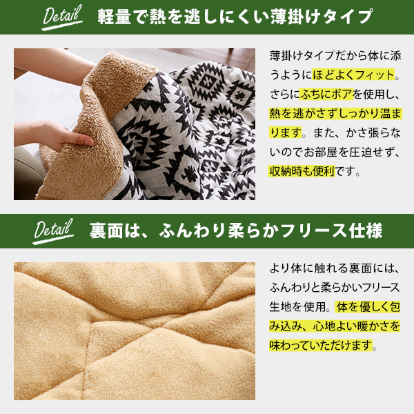 ●冬だけじゃもったいない、カジュアルテイストのおしゃれなこたつと、洗練された幾何学模様のトライバル柄薄掛け布団の2点セット!