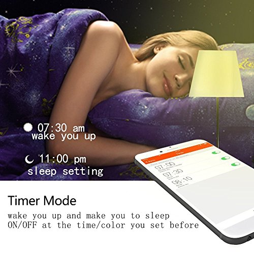 - PROGRAMMABLE TIMER➤Create customized schedules to turn the bulb’ on and off time. Such as programming at 6am with lamp on to remind you to get up or at 11pm with lamp off to remind you to sleep. One bulb can be programmed for max 10 timing, and one smart phone can connects and control max 150 bulbs.