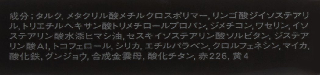 Talc, methyl methacrylate crosspolymer, diisostearyl malate, trimethylolpropane triethylhexanoate, dimethicone, petrolatum, hydrogenated castor oil isostearate, sorbitan sesquiisostearate, Al distearate, tocopherol, silica, ethyl paraben, chlorphene