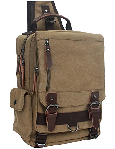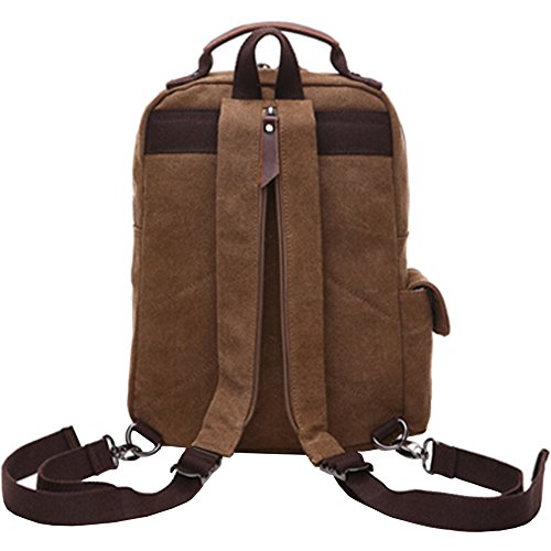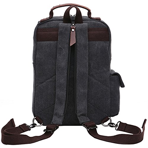 -. Feature : Material: Soft and durable Washed Canvas with Leather Decoration. The messenger sling bag is made of a very durable looking canvas material on the outside and a softer, more luxurious material inside the main compartment. / Size: 10.6*14.1*4.3 in (L*H*W). The shoulder bag can fit a laptop up to 13". This canvas sling bag is not a large backpack, but it is a great size to take to a day trip or shopping. The bag can be either carried with the hand handle or adjustable shoulder strap. / The canvas backpack is vintage and multifunctional with lots of pockets. 1 zipper pocket is in the front flap; 1 zipper pocket and 1 open pocket is under the flap; 2 side pockets. The main compartment is fitted with two zip heads and pulls: 1 inner zipper pocket; 1 inner laptop pocket; 2 inner small pockets. A small laptop, iPhone, wallet, snacks, tickets and magazine will all fit comfortably with room left over for add-ons. / The buckles on the top flap open and close easily and keep everything very secure. The zipper pocket on the top flap can put tickets and passport for easy access. The straps is adjustable and ultra-comfortable across your back and chest. It can act as a single-shoulder bag/sling bag, or a cross-body bag for use. / It is a great daypack for school, dating, shopping and traveling in daily life. Although it is not waterproof, it also can be carried for outdoor activities, such as running, cycling, camping, etc. It is a great gift for your boyfriend, husband, father and son.