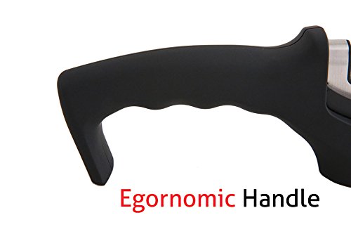 Durable and safety design: Ergonomic handle is equipped to provide users a firm grip, and the non-slip rubber base ensures that you are in full control of your knife sharpener