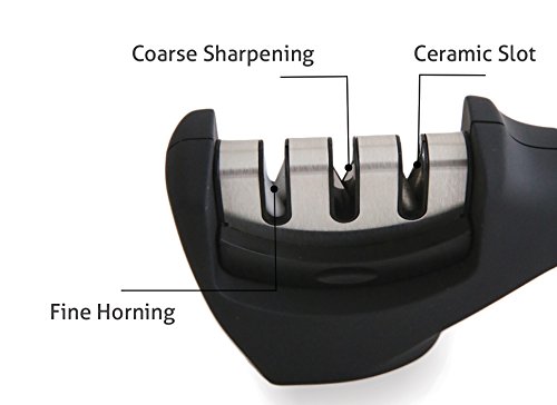 Suitable for both steel and ceramic blades: Ceramic slot is dedicated to ceramic knives and the coarse sharpening slot will sharpen the bluntest knife. The ceramic slot will eliminate the burrs on knives as well as finishing the edge with a nice and polished look