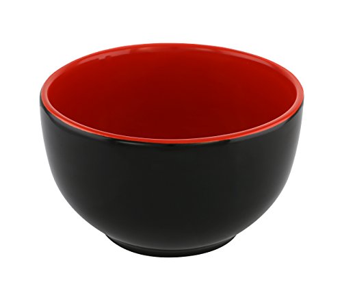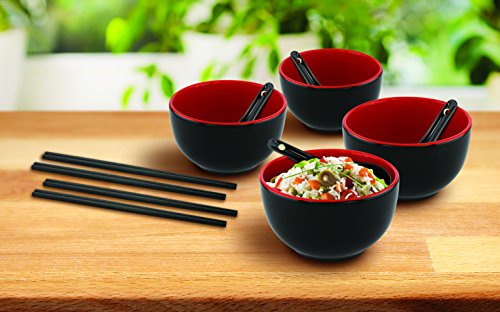 Wow your guests with the KOVOT Asian Cuisine Ceramic Serving Set. Set includes: (4) 20-ounce bowls, (4) oriental spoons, (4) sets of chopsticks. The beautiful red and black bowls are made of high quality, hand painted ceramic. The ceramic oriental spoons and wooden food-grade chopsticks complete the set. Microwave, dishwasher, and oven safe bowls - spoons are handwash recommended. Bowls Measure: 5"D x 3"H - Spoons 5"LFeature