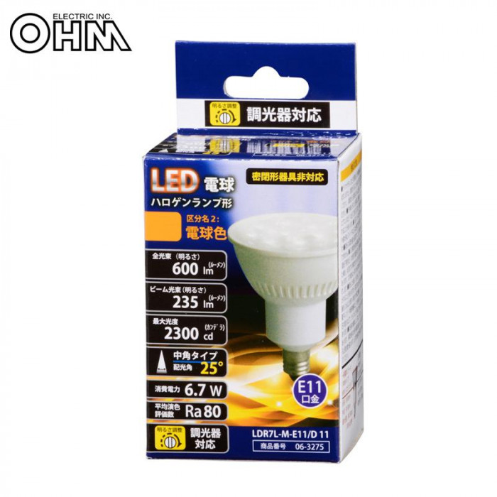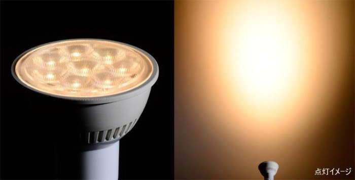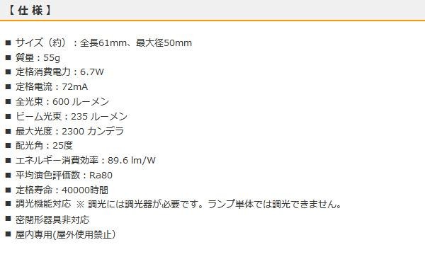 ハロゲンランプ形の調光器対応LED電球。光色は電球色で屋内専用です。