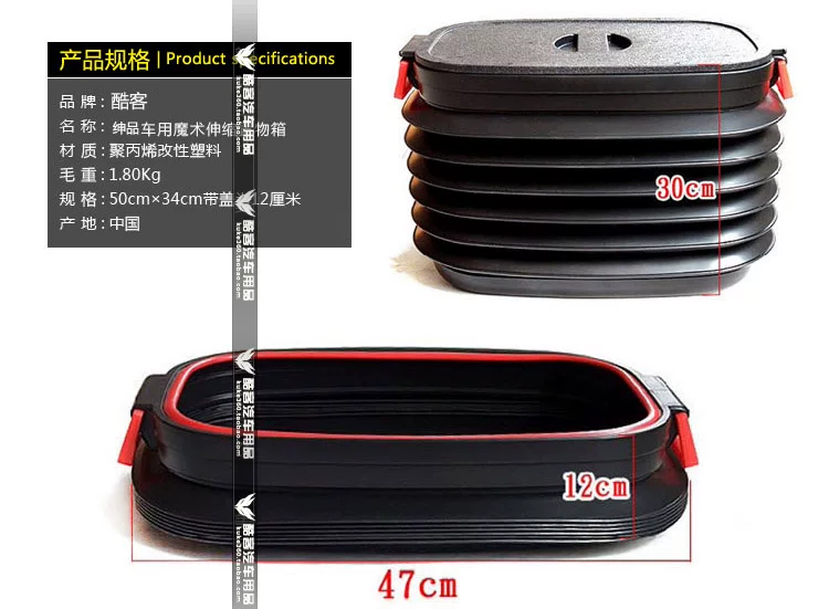 2, the folding multifunctional storage box has the advantages: light weight, does not increase fuel consumption; covers an area of small, space saving, solve the shortage problem of car use space. When not in use the folding of only 12 cm in height, use upup to 30 cm high, increasing the capacity of three times, capacity of 37 liters (L); at the same time, can according to need to adjust the height of the product drawing.