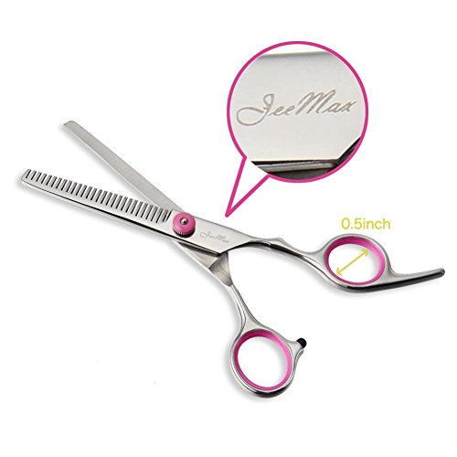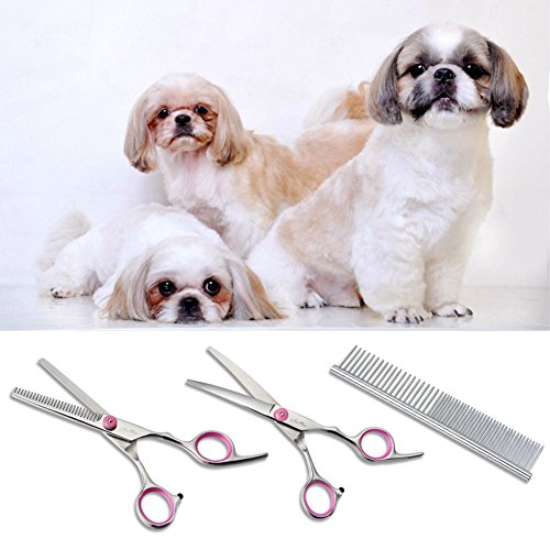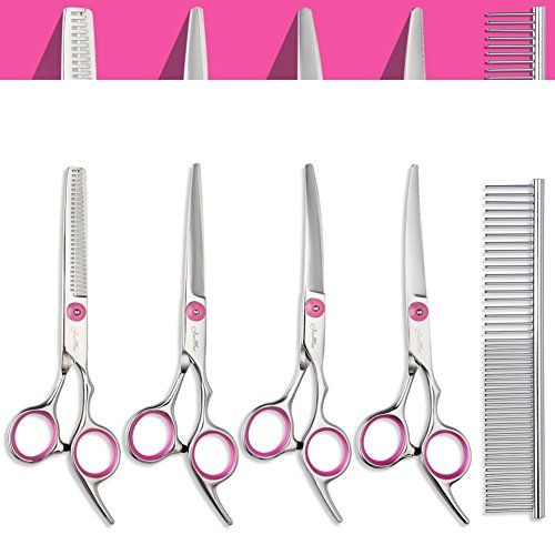 JEEMAX CATS DOGS SCISSORS TOOL KITS: 4pcs Stainless Steel Cats,Dogs Scissors, 1pc Steel Grooming Comb,with a Clean Cloth to clean the stainless steel scissors and for a better protection;The 28-tooth thinning shear has a 25% thinning rate, great for removing tangles and dead undercoat;2 different curved scissor fit both left and right hands