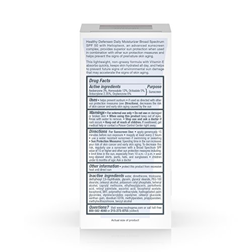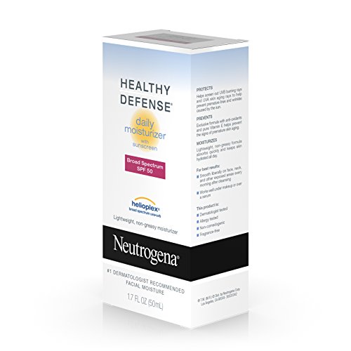 Keep your skin healthy and youthful with Neutrogena Healthy Defense Daily Moisturizer with Broad Spectrum SPF 50 Sunscreen. This complete daily moisturizer helps provide superior protection from skin aging effects of the sun, when used with other sun protection measures. It absorbs quickly and keeps skin hydrated all day. This Broad Spectrum SPF 50 lotion contains Helioplex, an advanced sunscreen technology with Broad Spectrum UVA/UVB protection. The moisturizer protects against UVB rays, which cause sunburn and UVA rays, which contribute to premature lines, wrinkles, sagging, and age spots. Formulated with the exclusive antioxidant blend with pure vitamin E, it also helps prevent environmental damage to your skin. This daily moisturizer comes from the Neutrogena Healthy Defense collection, and is the number-one dermatologist-recommended facial moisturizing product.Feature