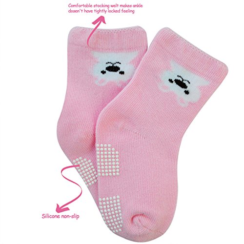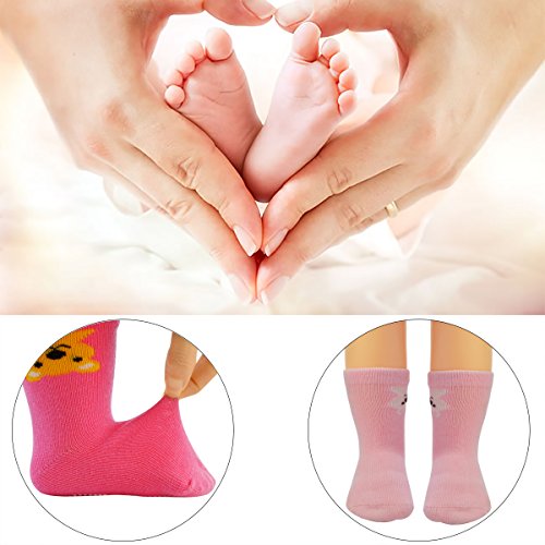 PROTECT YOUR BABY! These socks are perfect for the fussy baby that kicks off their socks! They are great socks that allow plenty of room to grow into, anti-slip bottom prevent fall down for your toddler from smooth wood floors. They are just adorable and the white-dotted skid proof bottoms to make them great for baby feet and start to walk. If you are looking for a baby gift or have a toddler of your own, this pack is great because of the variety of colors and patterns and the light breathable material. They are easy to get on and older toddlers are probably big enough to dress their little feet all by themselves, helping Mom out. Great for all surfaces - indoors, outdoors, wood floors, playground, day care and play areas. Super cute design, machine washable, will not fade and shrink when machine washed. 0