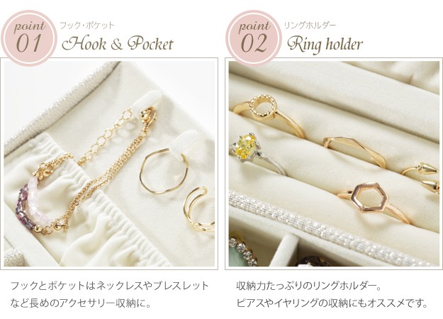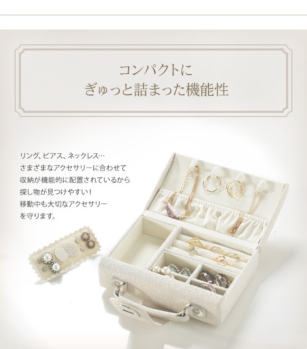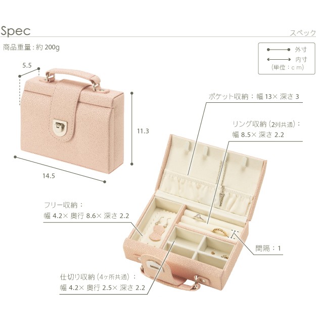 ※メーカー直送のため代金引換はお受けできません。※沖縄・一部離島は別途送料がかかります。お見積もりいたしますのでお問い合わせ下さい。商品について:小さな旅行鞄のようなおしゃれなジュエリーボックスです。コンパクトながらも収納力は高く、15点~20点ほど入れることができます。お手持ちのアクセサリーが少ない方はもちろん、仕事中や旅行先などちょっと外しておきたいときにも安心して収納。光沢のあるソフトな色合いのケースは上品さもあり、贈り物としてもお勧めです。サイズ(cm):幅14.5x奥行5.5x高さ11.3cm・約200gフリースペース、仕切りスペースの深さ:2.2cmフタ裏ポケットの深さ:3cmフック:4本ピアスホルダー:穴8つカラー:ピンク・ホワイト材質:外貼り-合成皮革(PVC)、内貼り-スエード調完成品株式会社ナカムラ(12700003)
