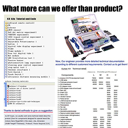Update version: The kit has 44pcs components With tutorial in a CD including project introduction and source code,add More modules:LED Thermistor Touch sensor module than old version. High quality feedback from our customers makes it more reliable