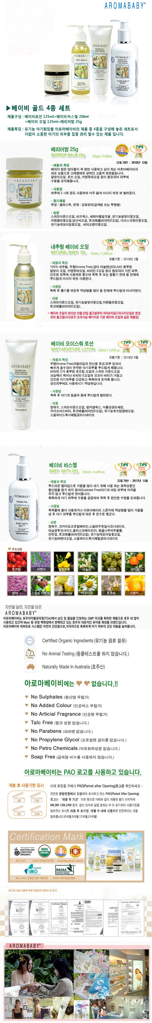 * 아로마베이비 제품중 베리어밤, 마사지오일과 베이비 비누를 계속 사용하다 보면 연한 미색에서부터 노란색(황금색) 또는 오렌지색의 제품을 볼수 있습니다. 이는 공통으로 함유되어 있는 "카렌듀라오일(Calendula Oil/금잔화=황금색을 띔)이 색상에 영향을 주는데 재배조건(토양,기후,일조량등)에 따라 색이 조금씩 차이가 있습니다. 인공으로 색을 첨가하지 않고 성분에 배어있는 색이 그대로 제품으로 나오기 때문에 인공색조와 같이 항상 같은색으로 나오지 않으며 연한 미색(보기에 따라 약간은 푸른색으로도 보일수 있음), 또는 노란색(황금색, 오렌지색)이 나올 수 있는 자연적인 현상입니다.