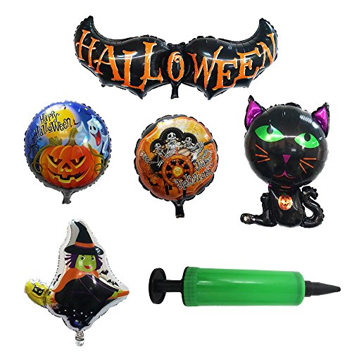 - PACKAGE INCLUDE: 5 pcs balloons with one random colour pump package: 1* 49.21ʺ long Halloween Bat, 1* Fly Witch with broom, 1* Ghost Pumpkin, 1*Pirates balloon, 1*Black Cat balloon