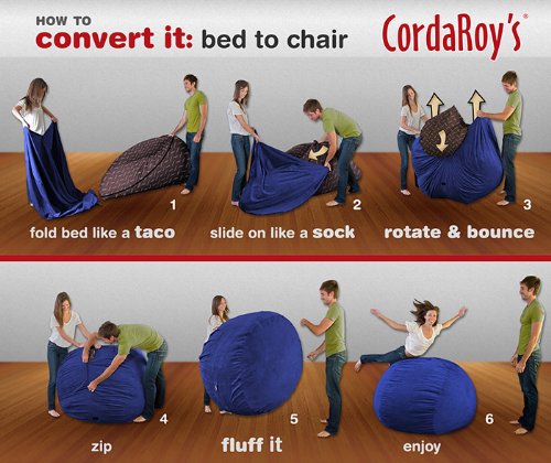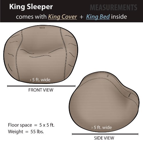 - Feature : CHAIR CONVERTS TO A STANDARD KING-SIZE BED. A great night's sleep is in the bag. / Comes complete with (1) King Chair Cover and (1) King Bed insert. ● Seats 2 Adults - 60" Wide ● Sleeps 2 Adults ● Patented King Bed inside (76 x 80 x 10 inches) / Changeable, Washable & Dryable Cover. ● Filled with Premium super soft Shredded Foam. (The same foam inside most sofa cushions but shredded. All new. Not recycled!) ● Sturdy cotton/poly bed with safe-lock zippers. ● Vacuum-packed for easy transport. / Lifetime Guarantee. All of our fabrics are tested and guaranteed. Comfort for Life. / Visit our website for more options.