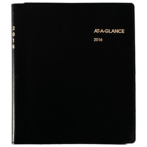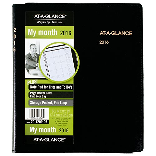 Monthly planner has a concealed wire behind a durable, black, simulated leather cover