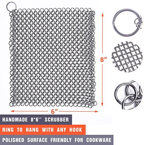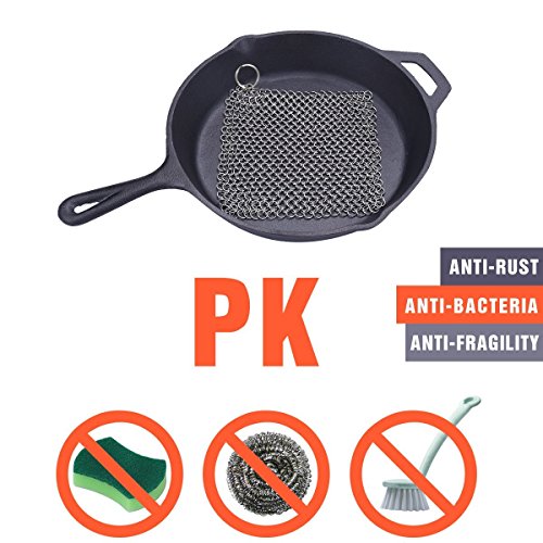 DURABLE AND RELIABLE:The cast iron skillet cleaner is handcrafted by food grade stainless steel material. Lightweight and convenient for cooking in home, camping or travel