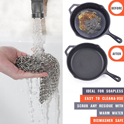USER FRIENDLY:Each chainmail round ring is meticulously handcrafted with the highest quality stainless steel. Cast iron skillet cleaner will not scratch your pans