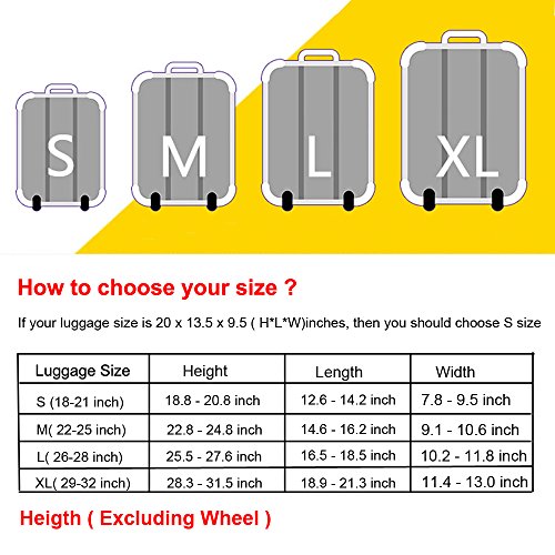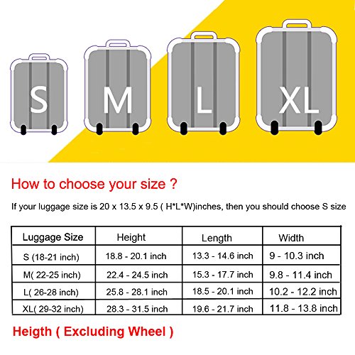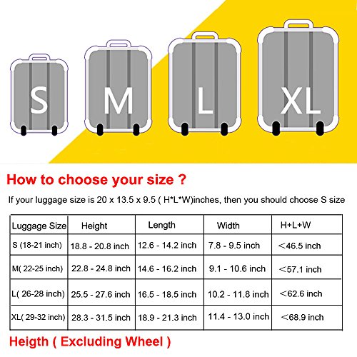 About Luggage Cover : 1.Made of durable 300 grams material, 8% spandex and 92% polyester. 2.Thickness cover can protect your luggage against scratch and dust. 3.Double-stitched all over, full of stretch and high elasticity. 4.Easy to fit and remove, extremely durable and washable fabric. 5.Highlight your personalized, don't worry to misplace your luggage. 6.4 sizes available to fit almost any luggage. Please measure the height,length and width of your luggage, Frequently Asked Question(FAQ): 1.what type of material is the luggage cover made of? Answer: It is made of polyester,Spandex.The Fabric is very soft,flexible and thick. It is not easy to fold and color fading. Stretch material 2.How does this go through security? Answer: There is no problem with security with this cover check in, you don't need take it off to go through security. 3.how to choose the cover for your suitcase? Answer: There is Size S, Size M, Size L,Size XL,which will fits the luggage 18 - 32 inch; Size S (Suitable for 18---22 inch luggage) , Size M (Suitable for 23---25 inch luggage), Size L (Suitable for 26---28 inch luggage), Size L (Suitable for 29---32 inch luggage) 4.Is it closed by Velcro or Zipper? Answer: There is Zipper one and Velcro one, please check it before order it,The Velcro one and zipper one with a stretch belt to fix luggage. Note: :The measurement may have 1-3cm (0.39-1.18 inch) inaccurate errors. There might be slight colour deviation due to different displays Cover ONLY, suitcase not included Have you experienced your luggage being scratches and stains after going through a horror path of airline handling process? This stretched suitcase cover will help you solve this problem,you can have a try. Packing including: - 1* Cover ONLY, suitcase not included.