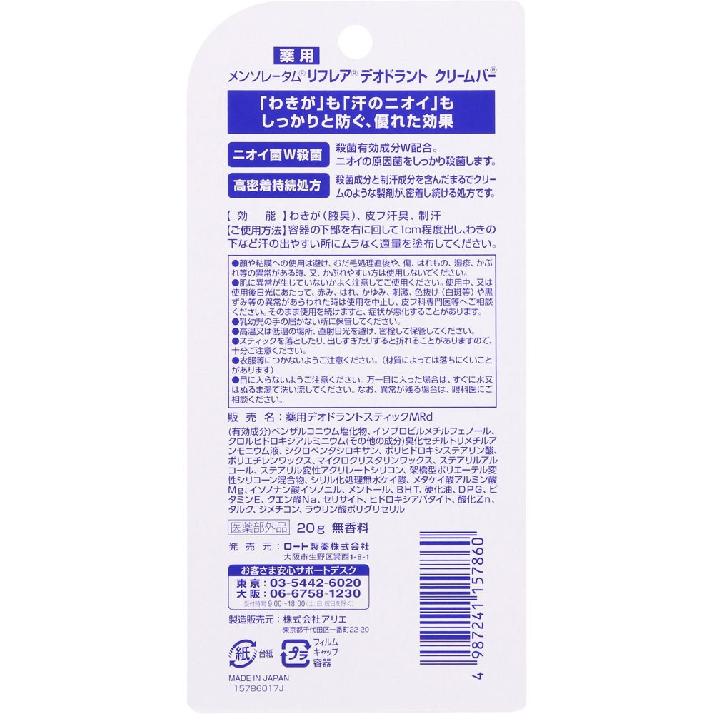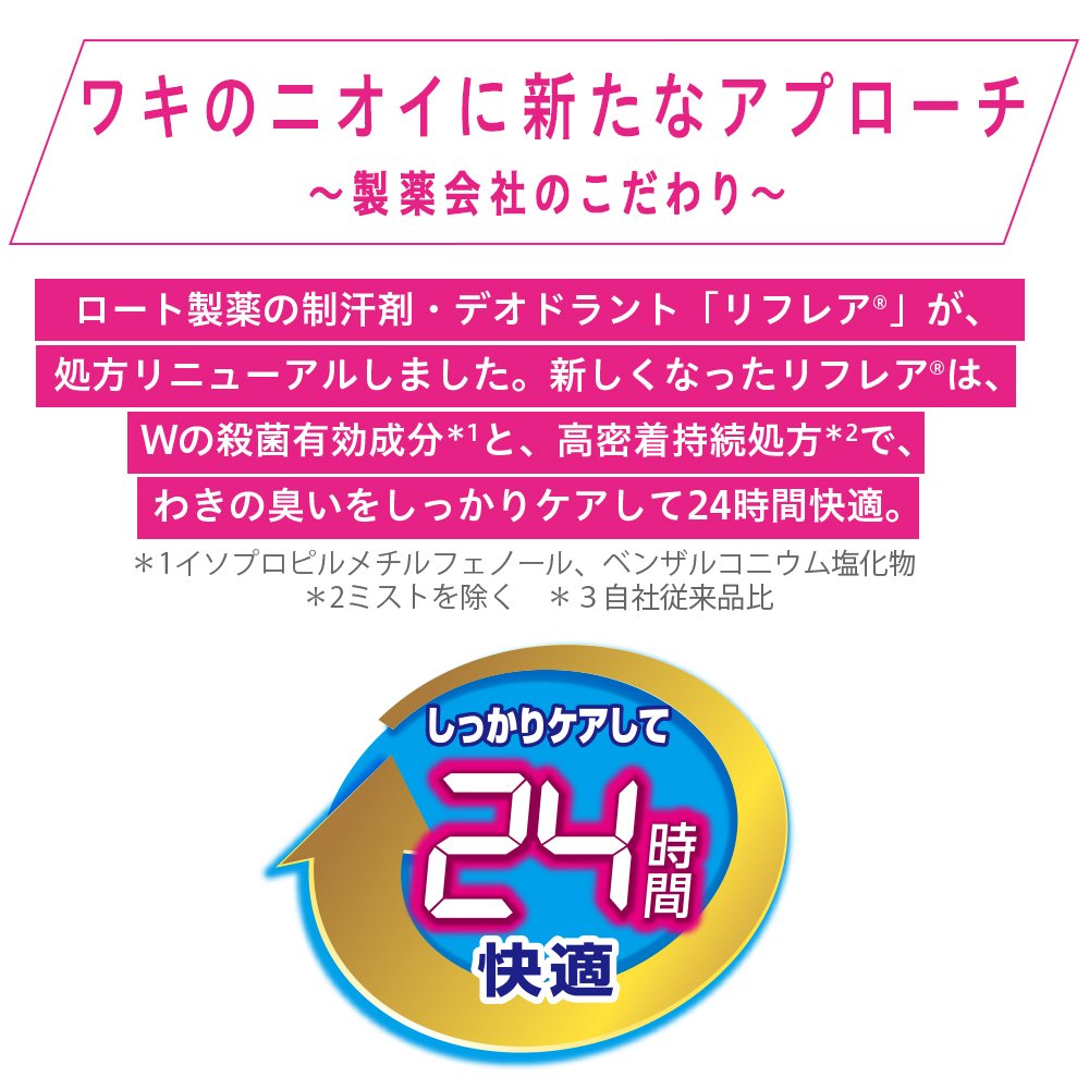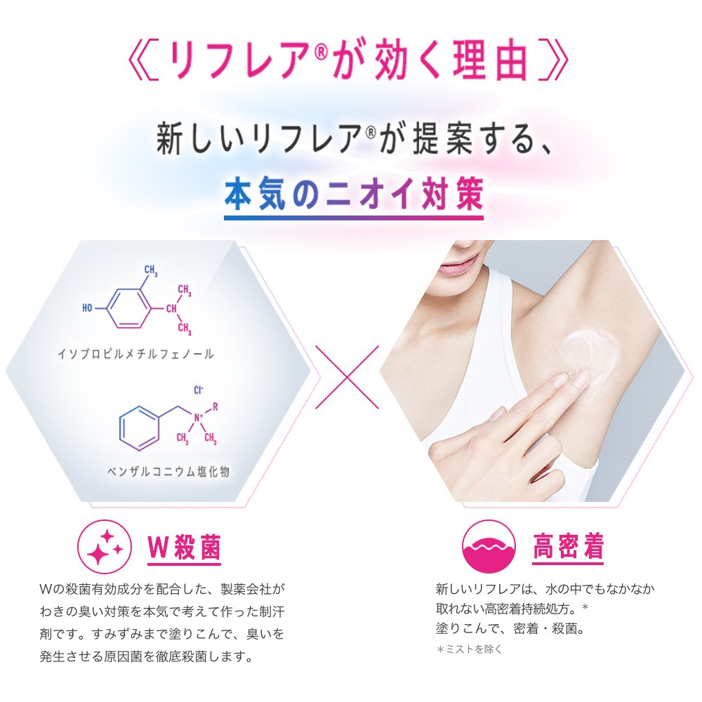 気になってしかたない「ワキのニオイ」。「リフレア」シリーズは、Wの殺菌有効成分*でニオイの原因菌をしっかり殺菌。気になるワキのニオイをしっかり抑えることにこだわりました。*ベンザルコニウム塩化物、イソプロピルメチルフェノール