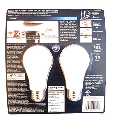 GE 10.5 W Reveal LED HD Light Bulbs (2-Pack), 60w Replacement, Dimmable, Radiant White Clarity, Energy Efficient