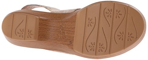 Wedge sandal featuring snake-pattern straps and buckle closure with hidden goring for adjustability