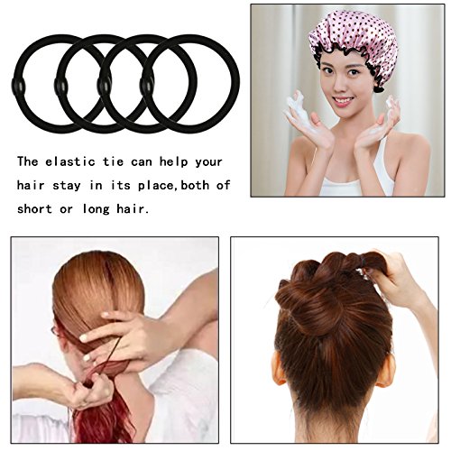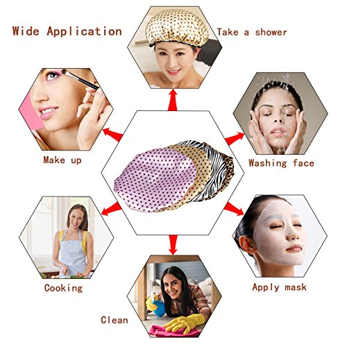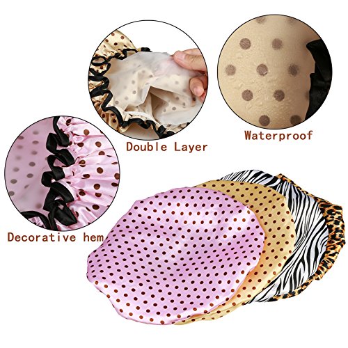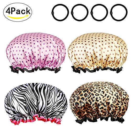 -. Feature : Waterproof & Tight - The bathing hair hat is composed of double layer.It is made of satin(outer layer) and eco-friendly material EVA(inner layer),excellent waterproof effect. And each bathing shower cap has an elastic band at the edge,tight enough around your hat to keep your long hair from getting wet when take a shower. / Fashionable & Reusable - Each set including 4 pcs cute shower caps and 4 pcs black elastic hair tie,funny and fashion,4 different fashionable pattern,pink and yellow polka with dot,leopard P.R.Int and zebra-stripe pattern,and decorative hem make it stylish,meet your various need. and it is reusable,easy to wash,you can use it for a long time. low P.R.Ice for 4 pack,it is well worth to purchase when you share them with your friends or neighbour. / Lightweight & Portable - This shower caps is made of soft satin material,fairly thin and light,easy to be folded into very small size,fit in your lage,backpack, travel bag when traveling or bussiness trip,very convenient,you can take it anywhere. / Large & Multipurpose - The shower caps are extra large, perfect for most of women, Not only for bathing shower,But also for making up,hair mask treatments,SPA,cooking and clean,it will keep your hair away from water and dirty or other make-up effectively. / Extra Elastic Hair Tie - We offer 4 pcs extra flexible elastic band matching with the shower caps,the elastic hair tie can help your hair stay in proper place,make you feel comfortable ,prevent your long hair from falling out of the shower cap.