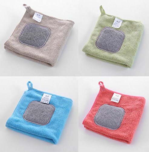 -. Feature : scouring pad 100% / superfine fibre 100% / 4-piece color cotton dish cloths: Blue/Red/Coffee/Green,To distinguish the use in different occasions / 100 scouring pad with superfine fibre side; each towel measures 12 inch by 12 inch / Super strong suction function, smooth, not easy to hurt hand. / Rich foam, decontamination quickly.