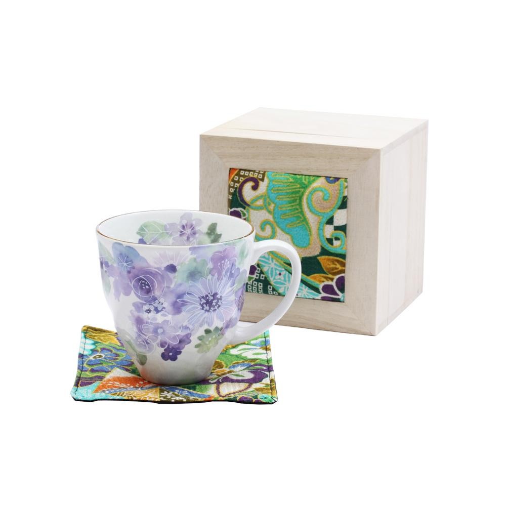 大小様々な花が織成す、上品な花柄の花工房。マグカップとコースターがセットになった、木箱入りギフトです。 |