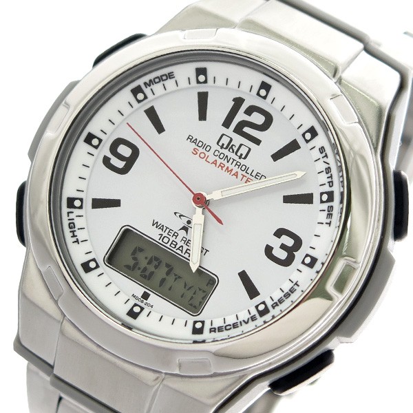 バンドカラー:シルバー、文字盤カラー:ホワイト、ケースの形状:ラウンドフェイス、表示タイプ:アナデジ表示、留め金:三ツ折れ両プッシュタイプ中留 フリーアジャスト、日付表示、曜日表示 その他 機能 アラーム 、 LEDライト、回転ベゼル 、 夜光インデックス 、ソーラー電波時計" 日本2局・中国・ドイツ・アメリカ電波受信、10気圧防水、フル充電時18ヶ月連続使用可