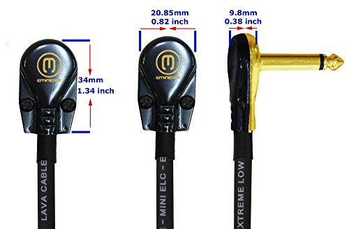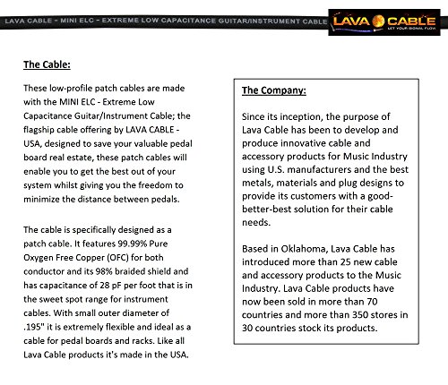 These low-profile patch cables are made with the MINI ELC - Extreme Low Capacitance Guitar/Instrument Cable; the flagship cable offering by LAVA CABLE - USA, designed to save your valuable pedal board real estate, these patch cables will enable you to get the best out of your system whilst giving you the freedom to minimize the distance between pedals.